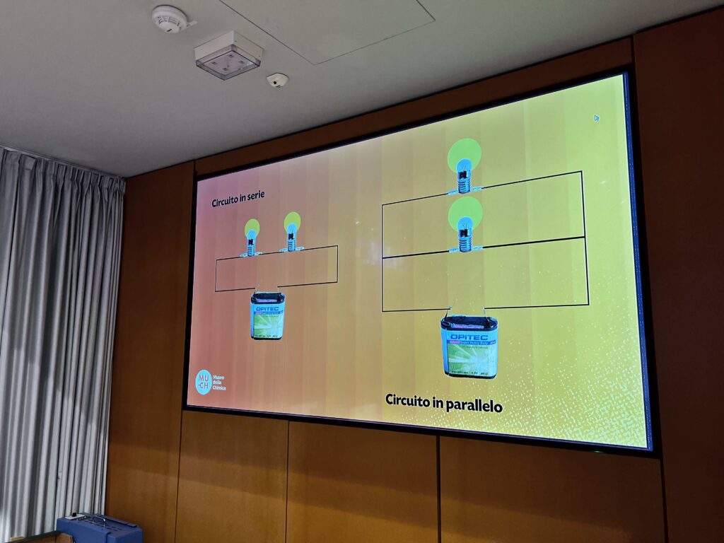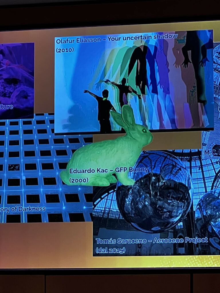 Prima di iniziare con lampadine e motori, è stato mostrato un esempio di come la scienza possa diventare arte… e far discutere. Si è parlato della celebre creazione del coniglio fluorescente, un’opera d’arte controversa che in passato ha acceso dibattiti su etica, arte e scienza. Un modo perfetto per introdurre ai bambini l’idea che tecnologia e immaginazione possono sorprendere… e talvolta scandalizzare!