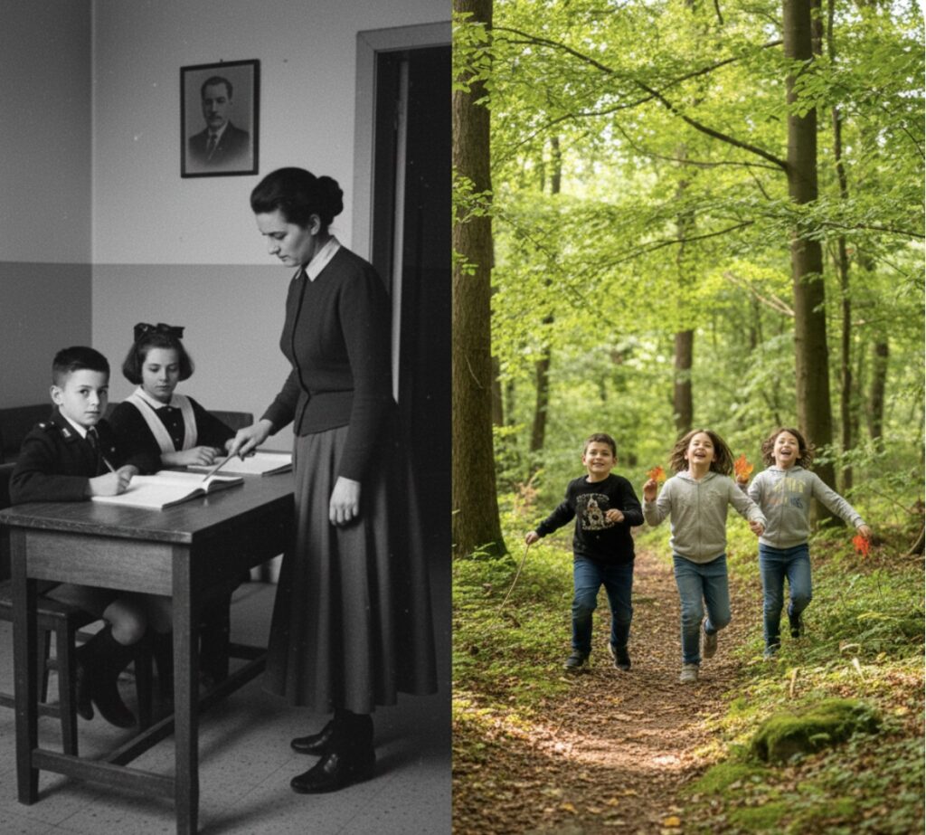 A sinistra la scuola ai tempi di Mussolini, a destra la scuola oggi.